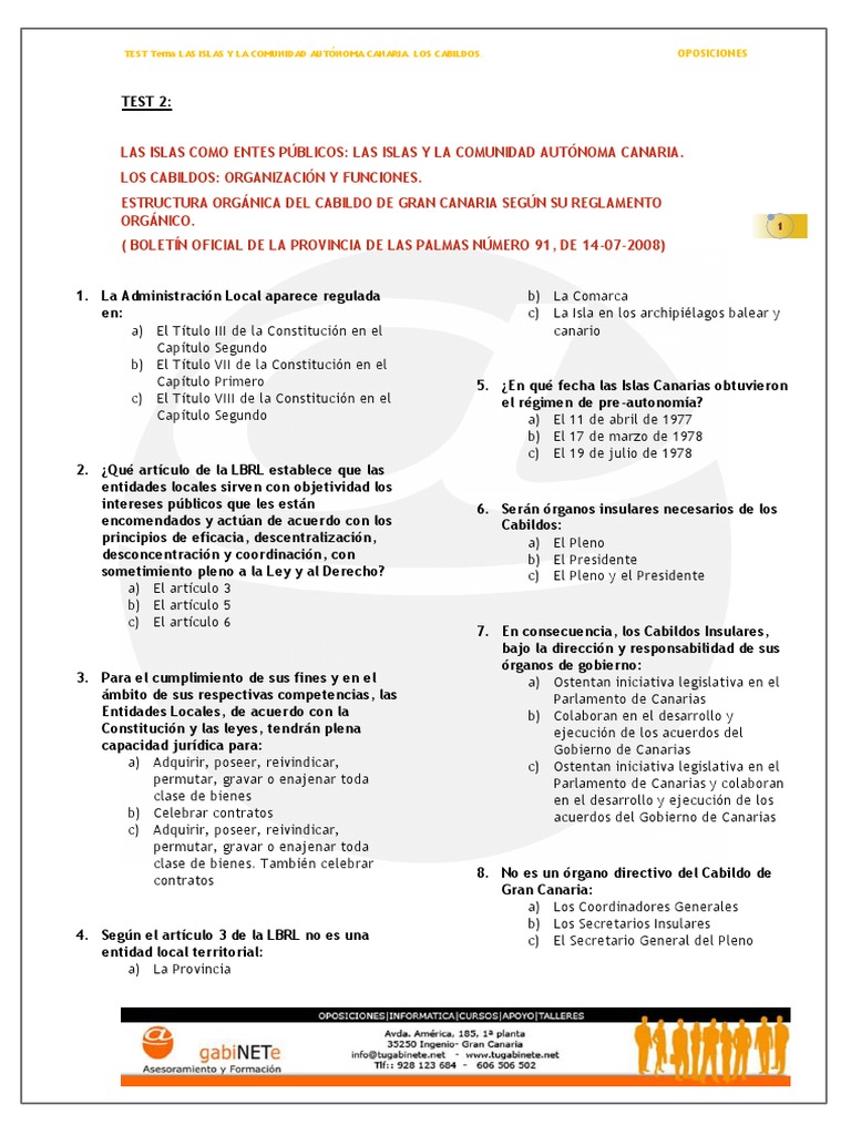 TEST Tema LAS ISLAS Y LA COMUNIDAD AUTNOMA CANARIA. LOS CABILDOS.