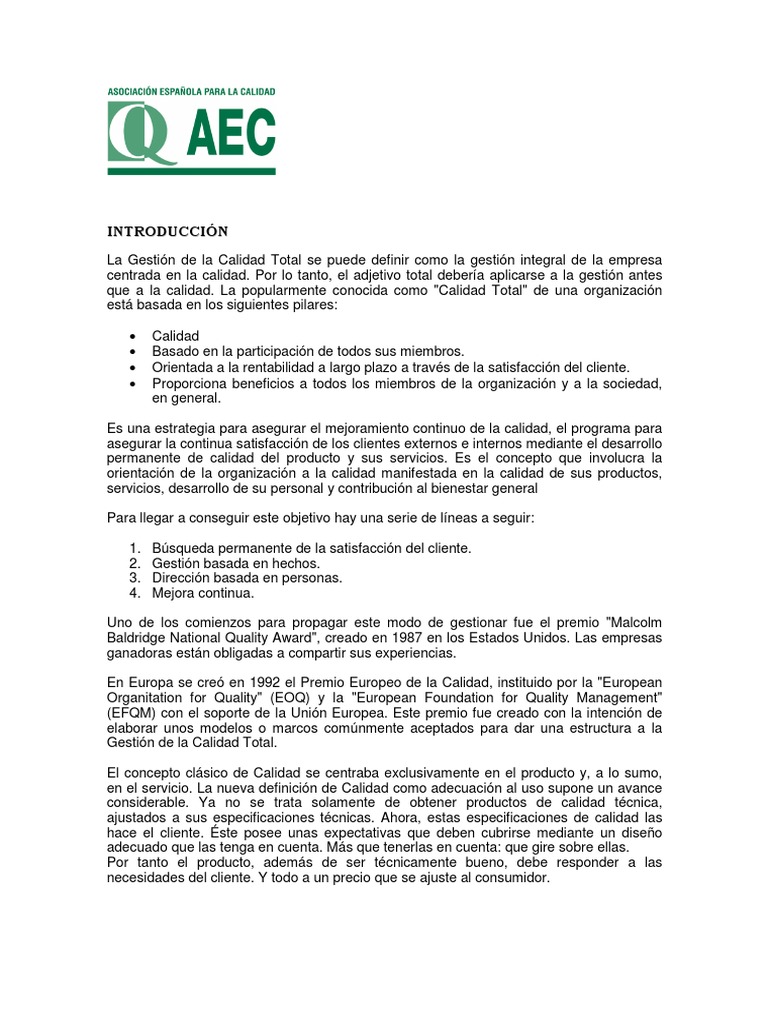 Los objetivos de la EFQM son promocionar la Gestin de la Calidad Total y demostrar los