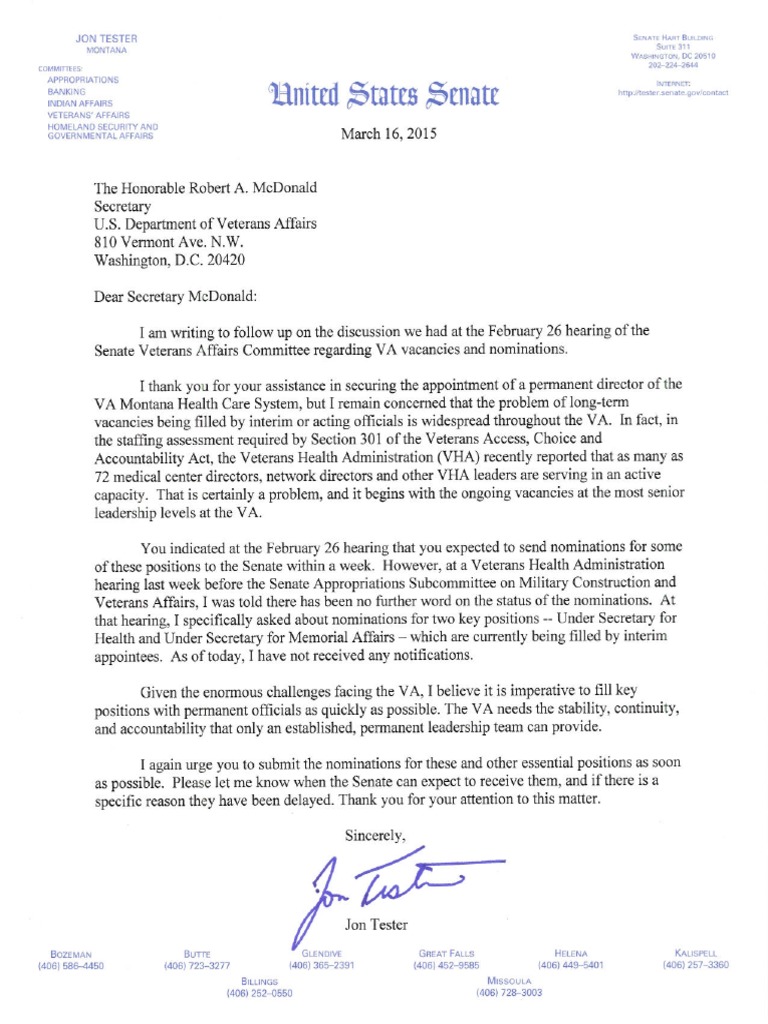 Senator Jon Tester's letter to VA Secretary Bob McDonald urging him to nominate a permanent VA Inspector General.