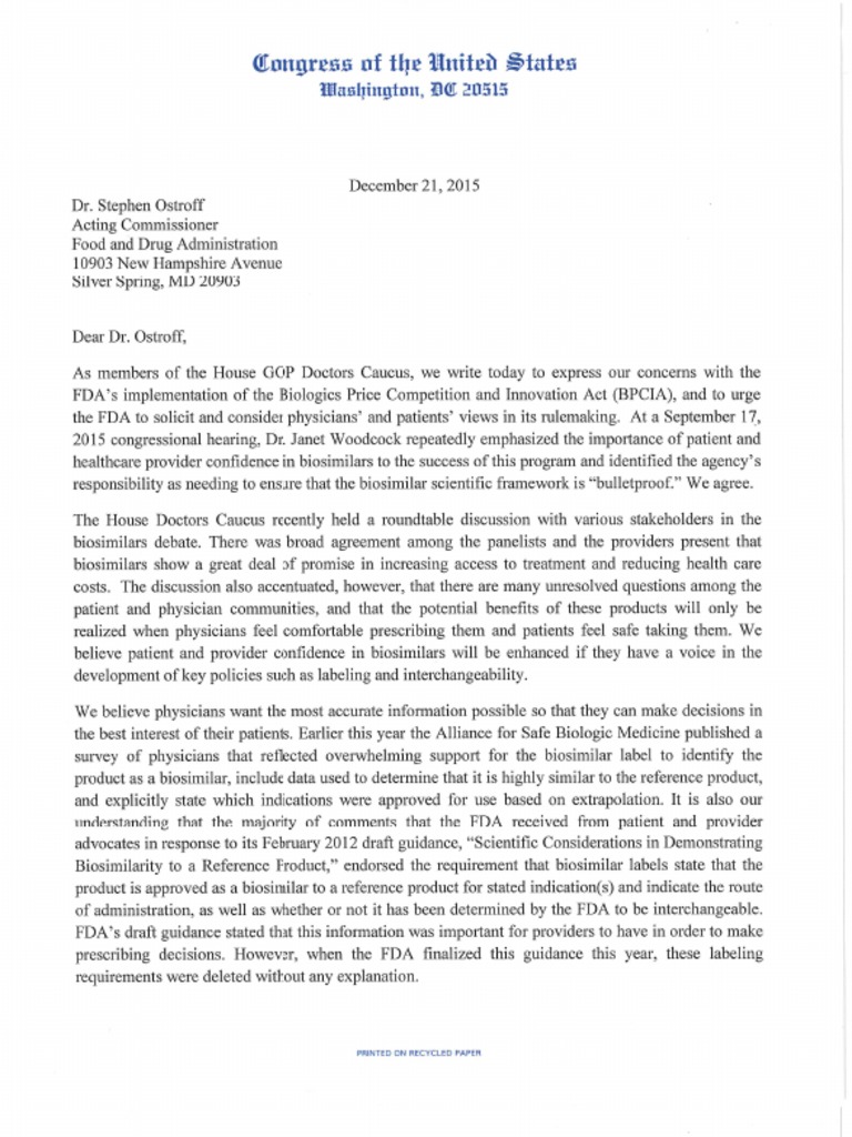 A dozen members of the House Doctors’ Caucus sent a letter to the Food and Drug Administration highlighting physician and patient concerns regarding labeling requirements for new biosimilar …Descripción completa