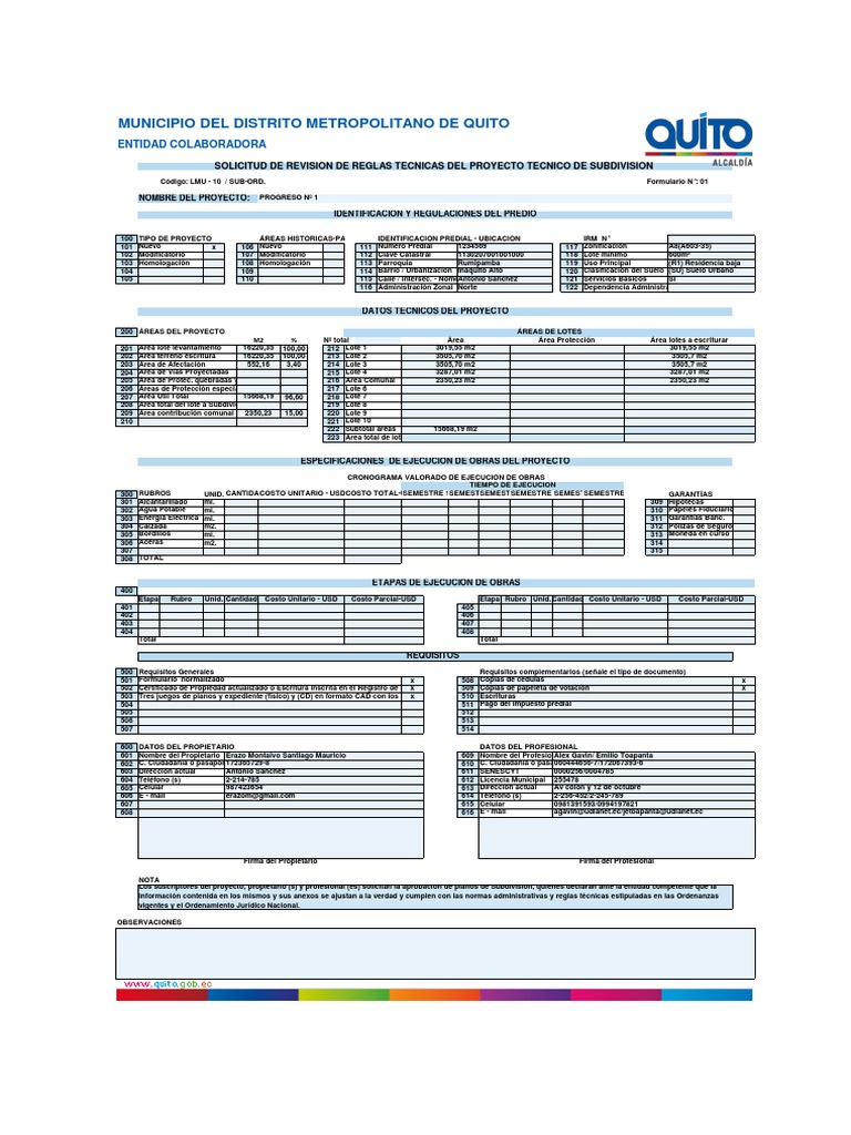 Los suscriptores del proyecto, propietario (s) y profesional (es) solicitan la aprobacin de planos de Subdivisin, quienes declaran ante la entidad competente que la