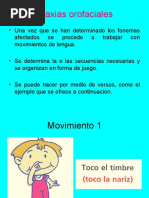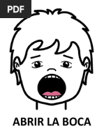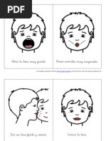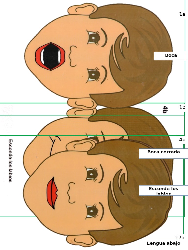 Este documento describe diferentes expresiones faciales, incluyendo la boca abierta o cerrada, sonrisas, frunciendo el ceño y posiciones de la lengua como arriba, abajo o a un lado.