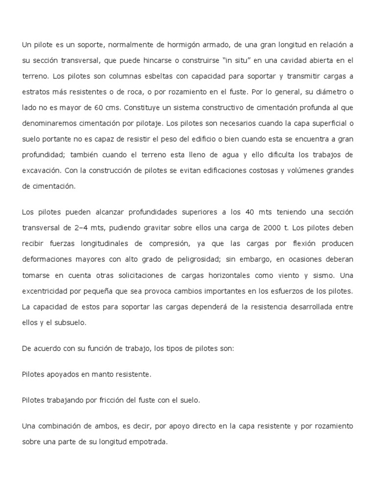 terreno. Los pilotes son columnas esbeltas con capacidad para soportar y transmitir cargas a