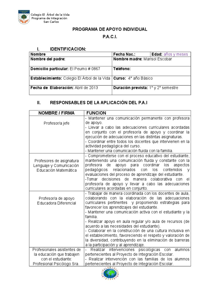 Establecimiento: Colegio El rbol de la Vida Curso: 4 ao Bsico