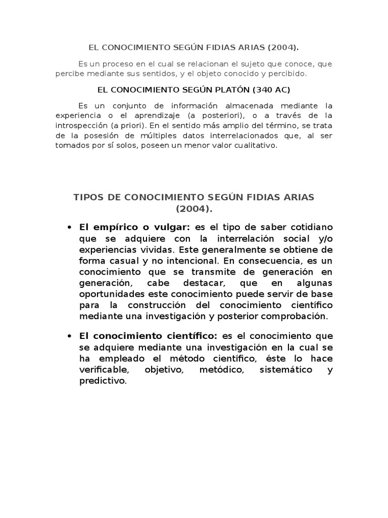 EL CONOCIMIENTO SEGN FIDIAS ARIAS (2004).