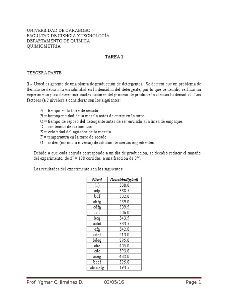 experimento para determinar cules factores del proceso de produccin afectan la densidad. Los