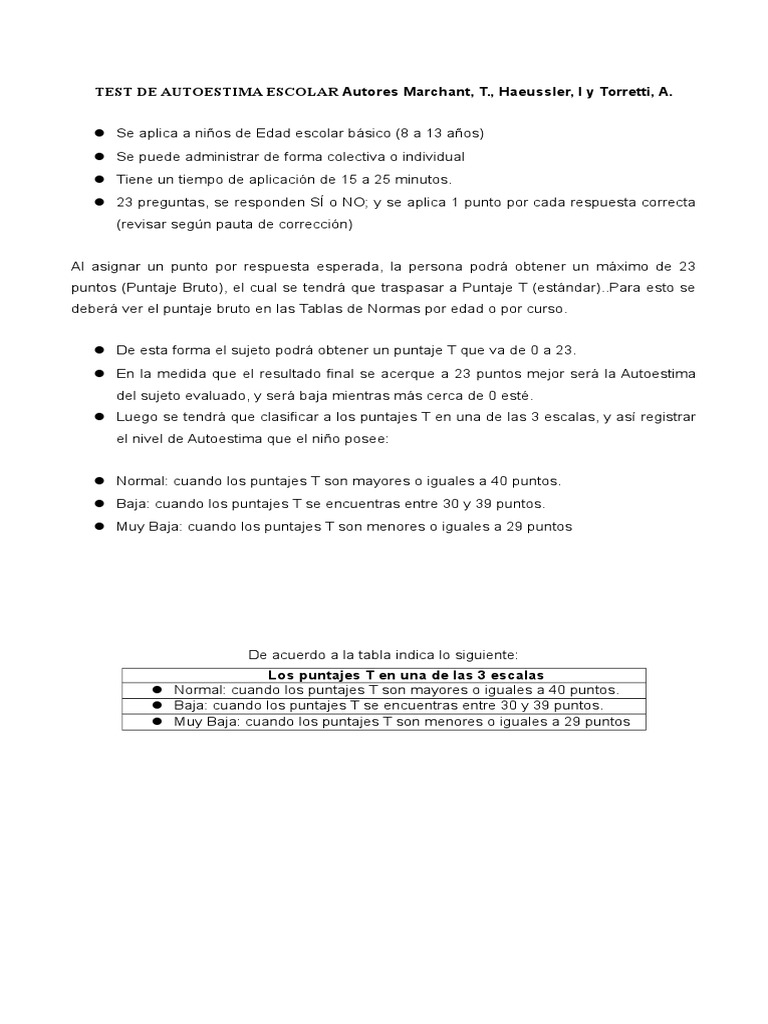 TEST DE AUTOESTIMA ESCOLAR Autores Marchant, T., Haeussler, I y Torretti, A.