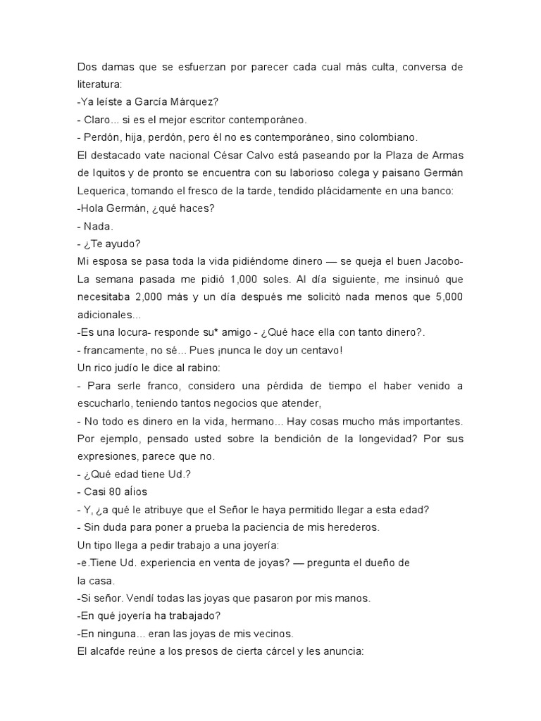 Mi esposa se pasa toda la vida pidindome dinero se queja el buen JacoboLa semana pasada me pidi 1,000 soles. Al da siguiente, me insinu que