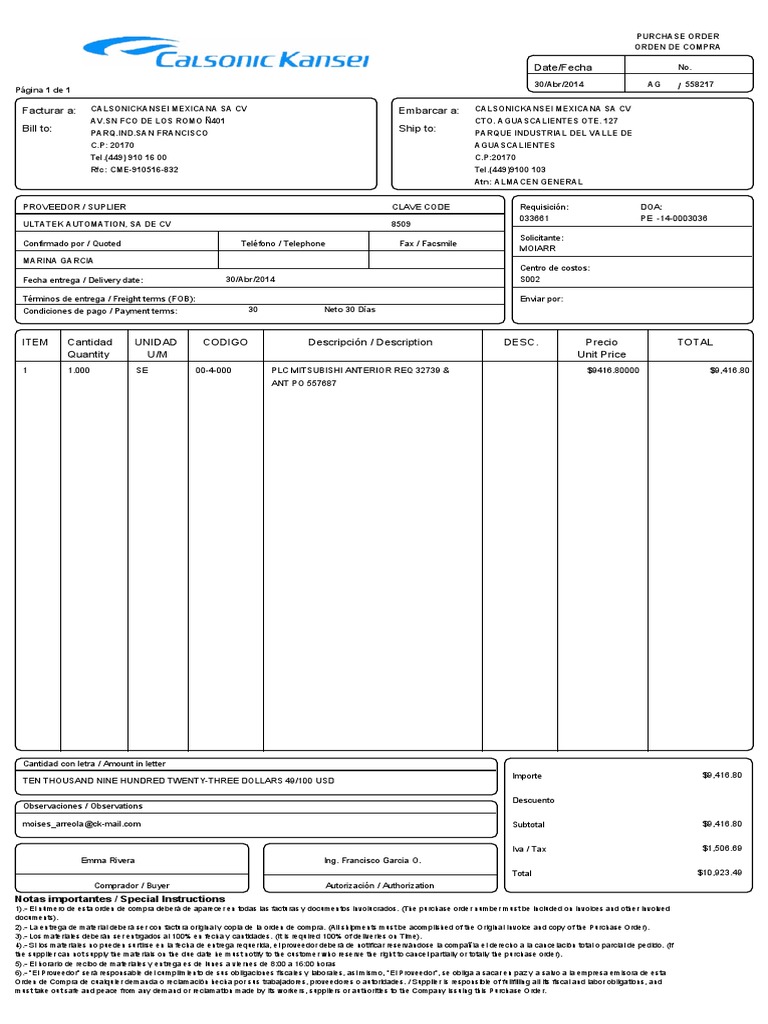 1).- El nmero de esta orden de compra deber de aparecer en todas las facturas y documentos involucrados. (The purchase order number must be included on invoices and other involved