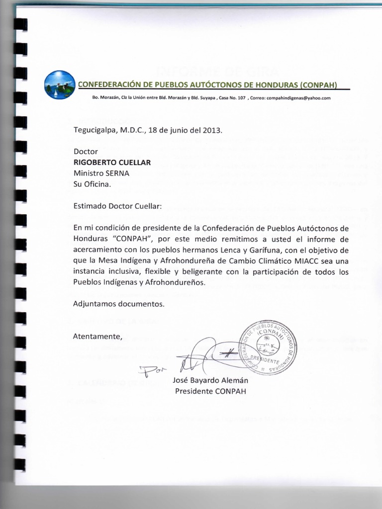 Honduras “CONPAH”, por este medio remitimos a usted el informe de