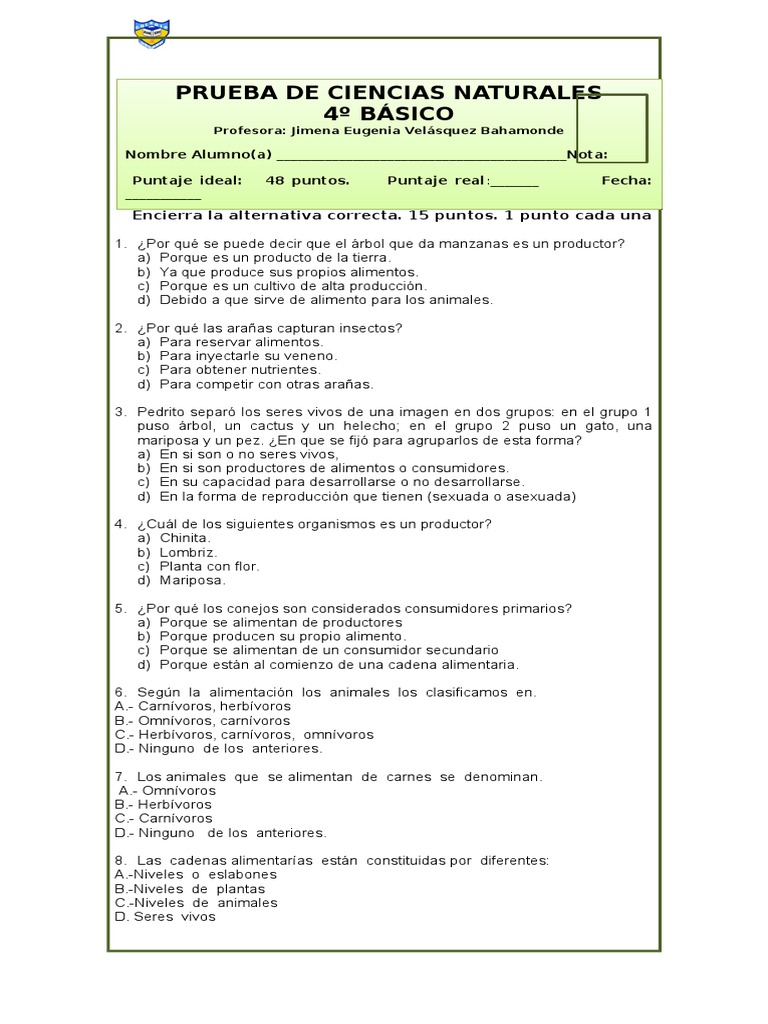 1. Por qu se puede decir que el rbol que da manzanas es un productor? a) Porque es un producto de la tierra. b) Ya que produce sus propios alimentos. c) Porque es un cultivo de alta produccin. d) Debido a que sirve de alimento para los animales. 2. Por qu las araas capturan insectos? a) Para reservar alimentos. b) Para inyectarle su veneno. c) Para obtener nutrientes. d) Para competir con otras araas. 3. Pedrito separ los seres vivos de una imagen en dos grupos: en el grupo 1 puso rbol, un cactus y un helecho; en el grupo 2 puso un gato, una mariposa y un pez. En que se fij para agruparlos de esta forma? a) En si son o no seres vivos, b) En si son productores de alimentos o consumidores. c) En su capacidad para desarrollarse o no desarrollarse. d) En la forma de reproduccin que tienen (sexuada o asexuada) 4. Cul de los siguientes organismos es un productor? a) Chinita. b) Lombriz. c) Planta con flor. d) Mariposa. 5. Por qu los conejos son considerados consumidores primarios? a) Porque se alimentan de productores b) Porque producen su propio alimento. c) Porque se alimentan de un consumidor secundario d) Porque estn al comienzo de una cadena alimentaria. 6. Segn la alimentacin los animales los clasificamos en. A.- Carnvoros, herbvoros B.- Omnvoros, carnvoros C.- Herbvoros, carnvoros, omnvoros D.- Ninguno de los anteriores. 7. Los animales que se alimentan de carnes se denominan. A.- Omnvoros B.- Herbvoros C.- Carnvoros D.- Ninguno de los anteriores. 8. Las cadenas alimentaras estn constituidas por diferentes: A.-Niveles o eslabones B.-Niveles de plantas C.-Niveles de animales D. Seres vivos