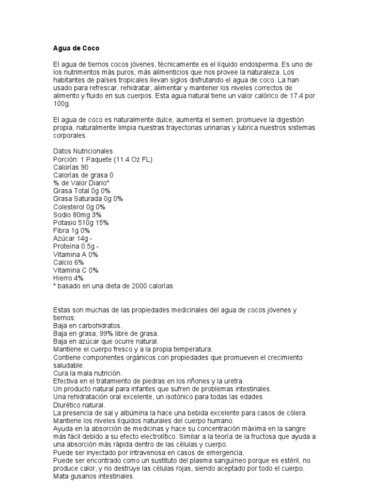 alimento y fluido en sus cuerpos. Esta agua natural tiene un valor calórico de 17.4 por