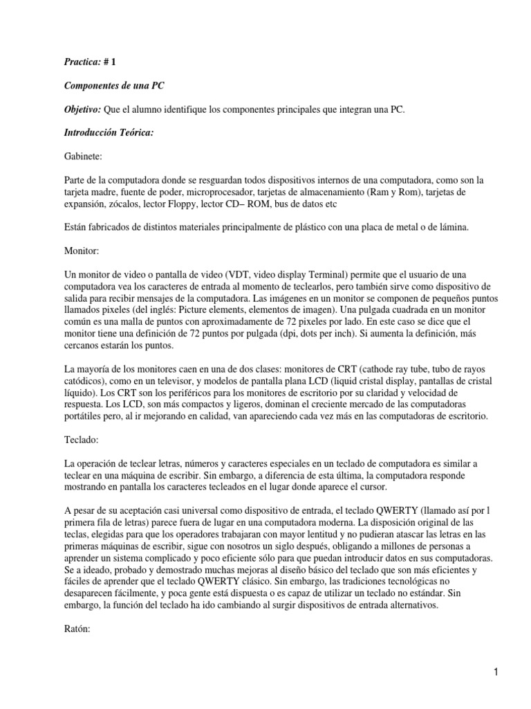 Objetivo: Que el alumno identifique los componentes principales que integran una PC.