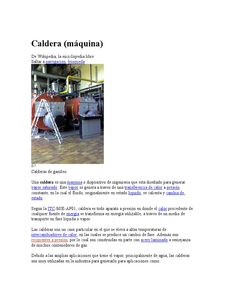 Una caldera es una máquina o dispositivo de ingeniería que está diseñado para generar vapor saturado. Éste vapor se