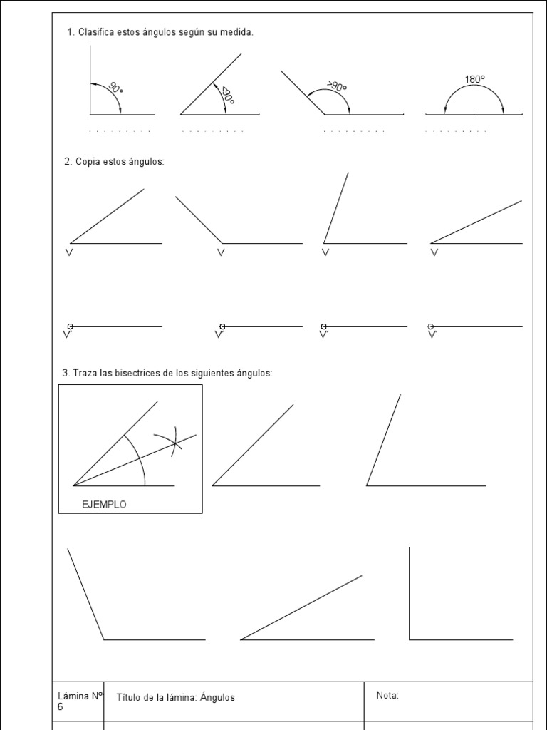 Este documento clasifica ángulos según su medida en ángulos menores de 90°, iguales a 90° y mayores de 90°, e incluye ejemplos de copiar y trazar bisectrices de ángulos.