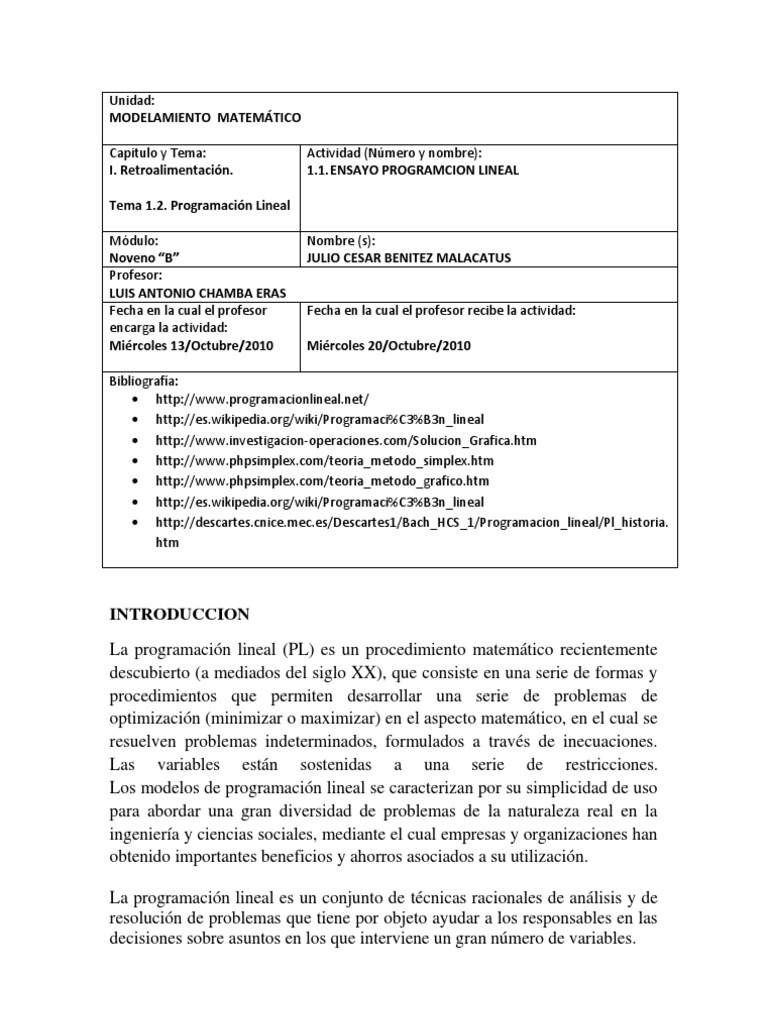 I. Retroalimentación. 1.1. ENSAYO PROGRAMCION LINEAL