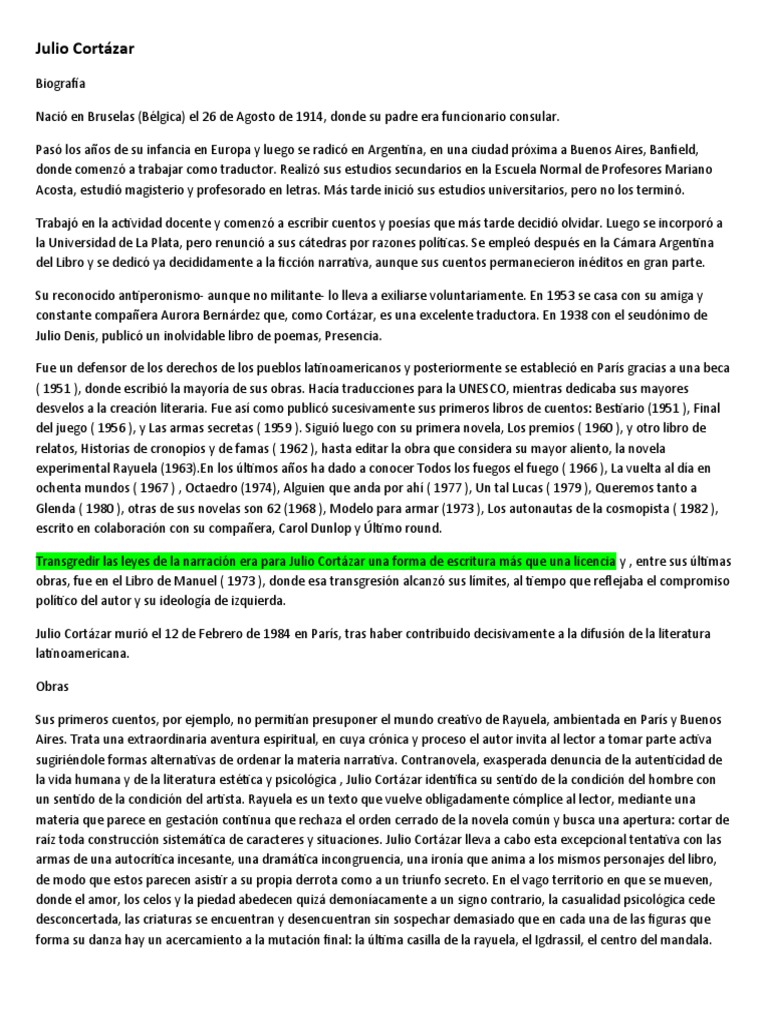 experimental Rayuela (1963).En los últimos años ha dado a conocer Todos los fuegos el fuego ( 1966 ), La vuelta al día en