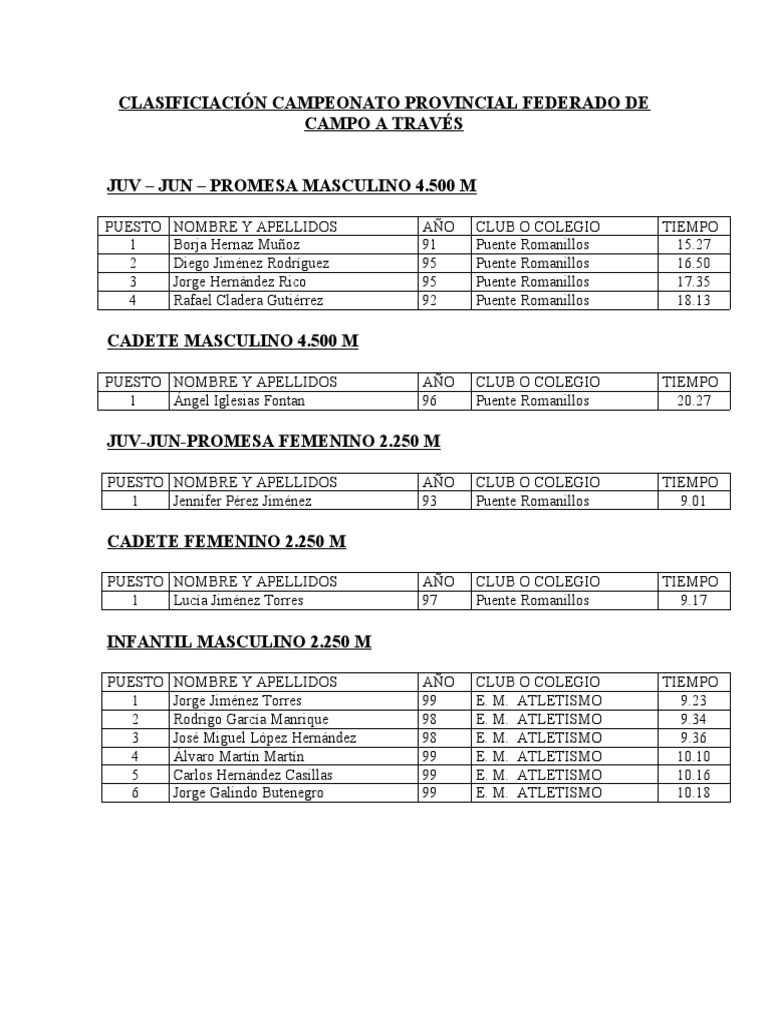 PUESTO NOMBRE Y APELLIDOS AÑO CLUB O COLEGIO TIEMPO