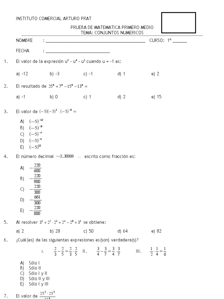 PRUEBA DE MATEMATICA PRIMERO MEDIO
