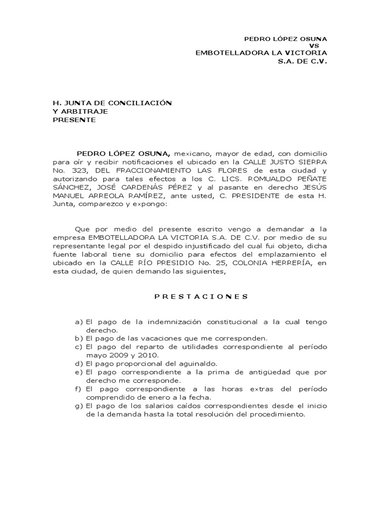 representante legal por el despido injustificado del cual fui objeto, dicha
