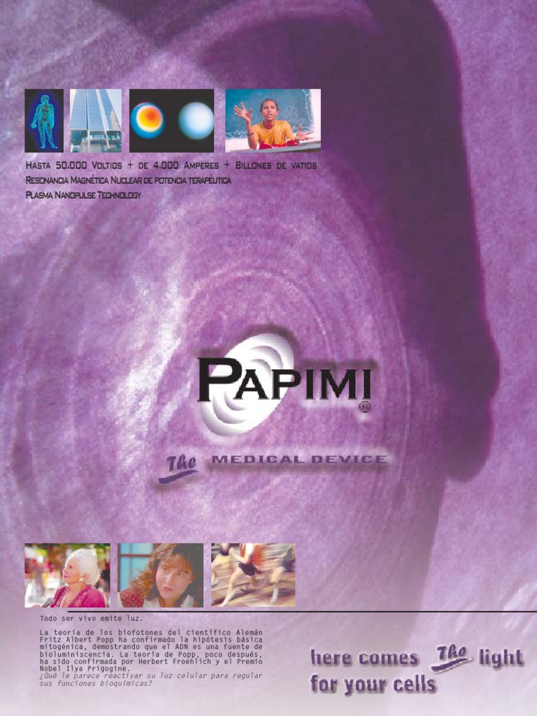 Este documento describe una terapia electromagnética llamada PAPIMI (Papimi Nanopulses) que utiliza pulsos iónicos de alta potencia para regular funciones celulares. La terapia induce pulsos iónicos de hasta 50,000 voltios y 4,000 amperios que penetran 15 cm de profundidad para restaurar la carga iónica celular perdida y mejorar los flujos iónicos. Se ha demostrado que esta terapia es eficaz para una amplia variedad de condiciones como dolor, inflamación, infecciones y tra