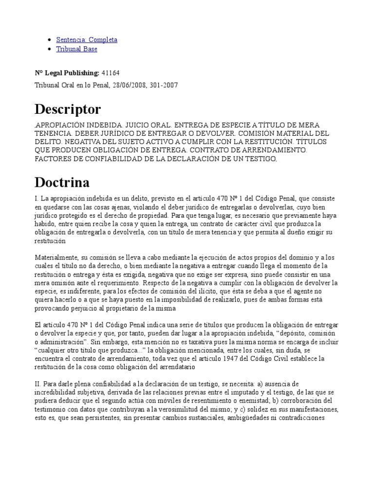 I. La apropiación indebida es un delito, previsto en el artículo 470 Nº 1 del Código Penal, que consiste