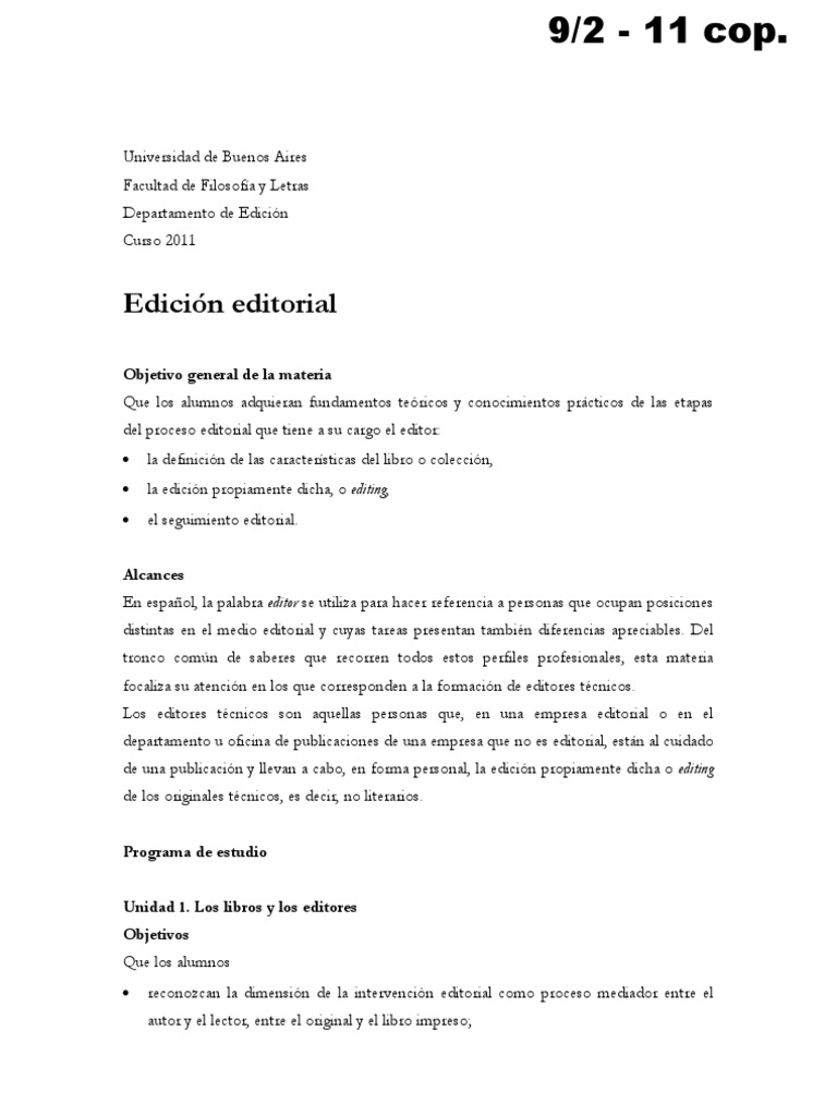 CÁTEDRA DE EDICIÓN EDITORIAL, FACULTAD DE FILOSOFÍA Y LETRAS,