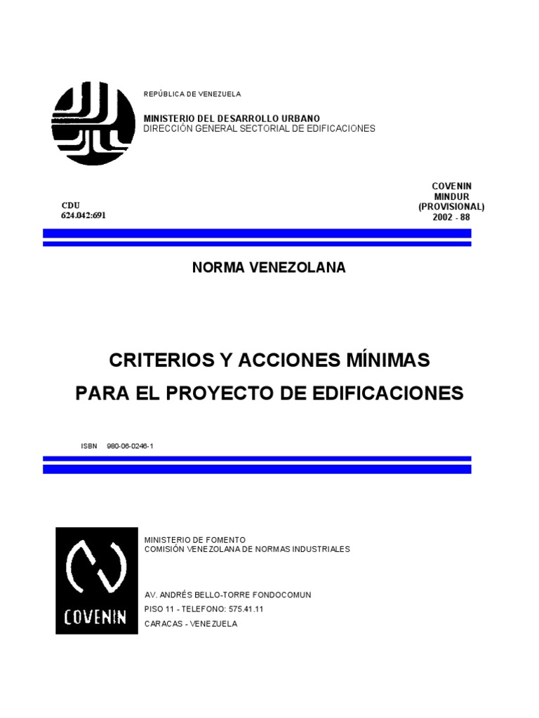 * "Criterios y Acciones Mínimas para el Proyecto de Edificaciones". Norma COVENIN - MINDUR 2002-88.