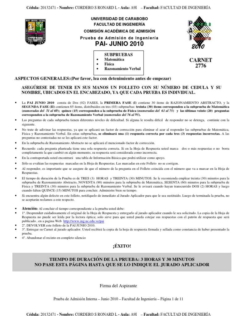 Prueba de Admisión Interna – Junio 2010 – Facultad de Ingeniería – Página 1 de 11
