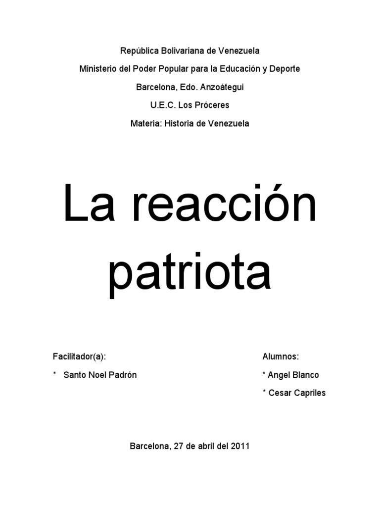 la reacción patriota en el cual ocurrió el exilio de Bolívar,