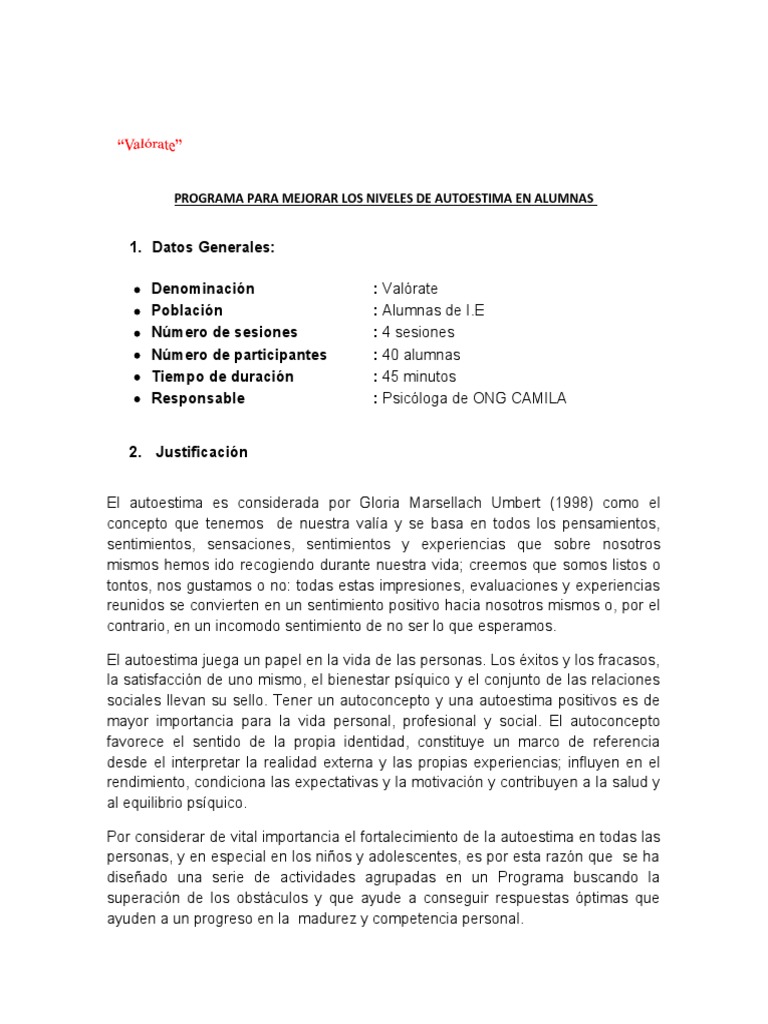 PROGRAMA PARA MEJORAR LOS NIVELES DE AUTOESTIMA EN ALUMNAS