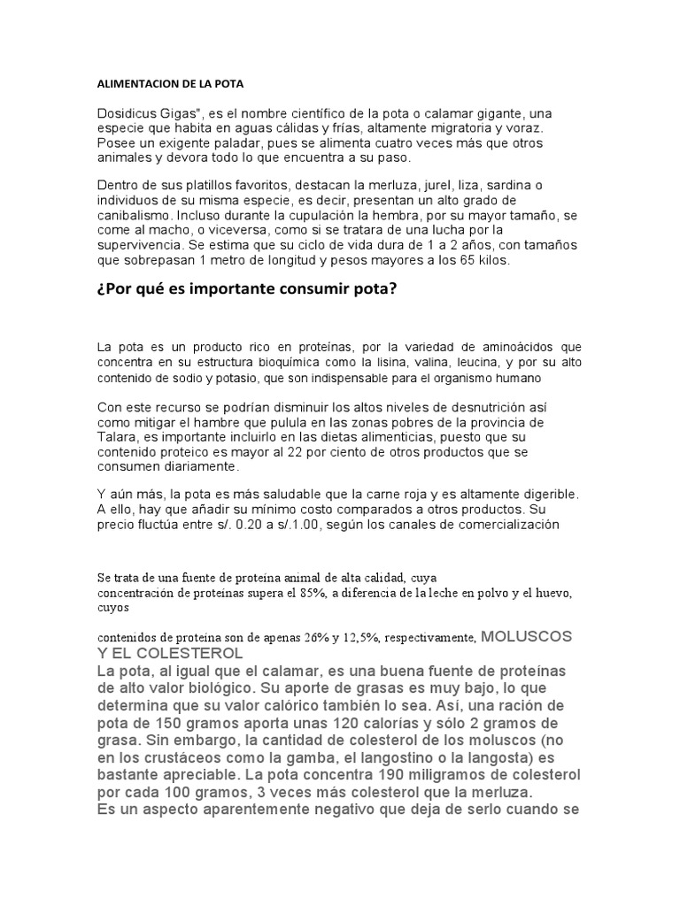 La pota es un producto rico en proteínas, por la variedad de aminoácidos que