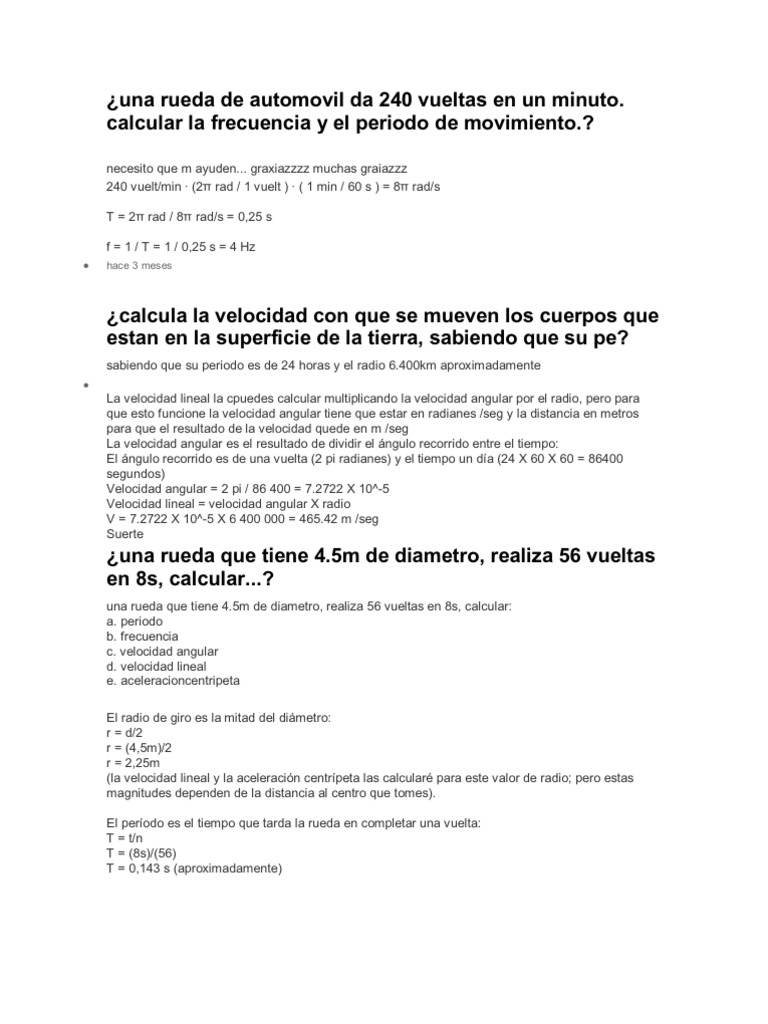 una rueda que tiene 4.5m de diametro, realiza 56 vueltas en 8s, calcular: a. periodo b. frecuencia c. velocidad angular d. velocidad lineal e. aceleracioncentripeta El radio de giro es la mitad del dimetro: r = d/2 r = (4,5m)/2 r = 2,25m (la velocidad lineal y la aceleracin centrpeta las calcular para este valor de radio; pero estas magnitudes dependen de la distancia al centro que tomes). El perodo es el tiempo que tarda la rueda en completar una vuelta: T = t/n T = (8s)/(56) T = 0,143 s (aproximadamente)