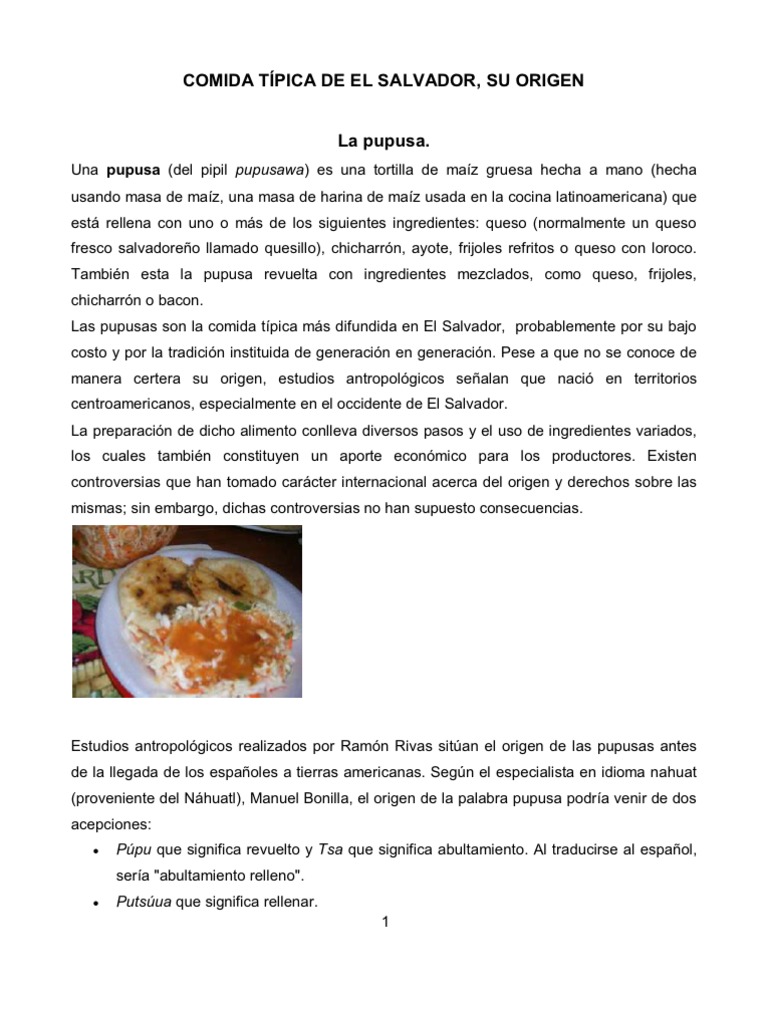 Estudios antropolgicos realizados por Ramn Rivas sitan el origen de las pupusas antes de la llegada de los espaoles a tierras americanas. Segn el especialista en idioma nahuat (proveniente del Nhuatl), Manuel Bonilla, el origen de la palabra pupusa podra venir de dos acepciones:
