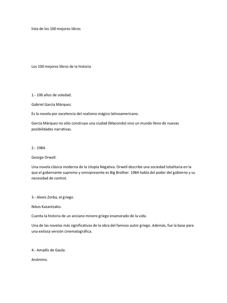 Este documento presenta una lista de los 100 mejores libros de la historia según la opinión del autor. Algunos de los libros más destacados son 100 Años de Soledad de Gabriel García Márquez, 1984 de George Orwell, y El Conde de Montecristo de Alejandro Dumas. La lista incluye obras literarias muy influyentes de diferentes géneros como novelas, cuentos y épica de una variedad de autores de diversas épocas y nacionalidades.