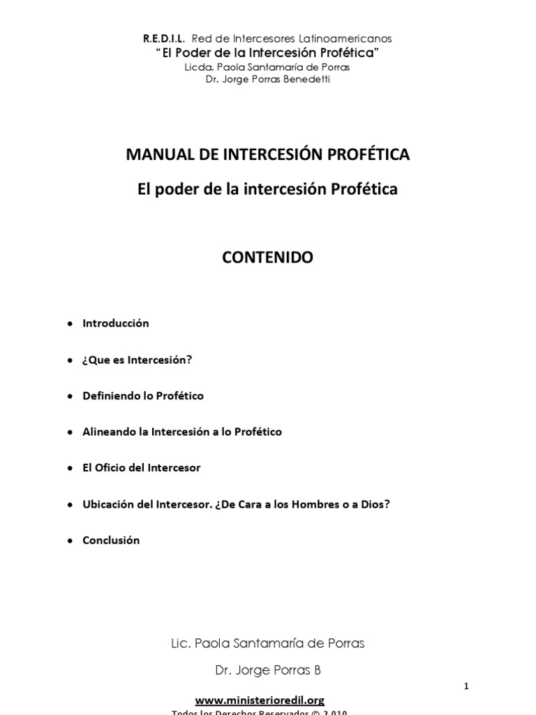 Como hemos podido leer en estas paginas, estamos viviendo un tiempo sin precedentes, un tiempo de reformas profundas y de cambios radicales que nos estn haciendo abandonar edificaciones, tradiciones religiosas, conceptos, ideologas, patrones de conducta, lneas de pensamiento etc. que estn alejadas del diseo divino. Es un tiempo en donde los Hijos del Padre celestial estamos siendo levantados como intercesores profticos como lo fue Yahshua HaMashiah que represento al Padre Celestial y los intereses de Su Reino ante la humanidad y el mundo espiritual. Somos intercesores, que estamos siendo llevados a movernos en nuevos niveles de autoridad con mayor poder de legislacin que nos permite denunciar, prohibir y cerrar toda influencia y autoridad ilegitima que este operando para establecer un diseo diferente al del Reino y limitar su accionar. Al mismo tiempo somos voz proftica que anuncia, permite y libera el fluir de la Ruaj Hakodesh (la presencia divina) para que se produzca un despertar que acelere el proceso reingeniera y restauracin que vivimos. Jeremas 1:10 Al levantarnos como intercesores profticos traeremos un nuevo peso de gloria que golpear con fuerza las lneas culturales paganas para que los hombres sean estremecidos y se alineen a los trazos del diseo celestial y podamos ver como en los primeros tiempos, ciudades enteras convertirse en un solo da. Es un tiempo que por causa de nuestras oraciones, proclamaciones, decretos y enseanzas profticas el ro de Dios (su revelacin) ser liberado y causar inundaciones que ahogaran los sembrados leviatnicos, lo que arruinara su obra, limitara su fluir y echara por tierra la manifestacin de su anti-diseo, lo que permitir que la jurisdiccin de nuestro Reino crezca en la tierra. Esperamos que el Eterno te introduzca en las profundidades de Su palabra y que Su revelacin te capacite sobrenaturalmente para que cumplas a cabalidad la carrera que tienes por delante como intercesor proftico.