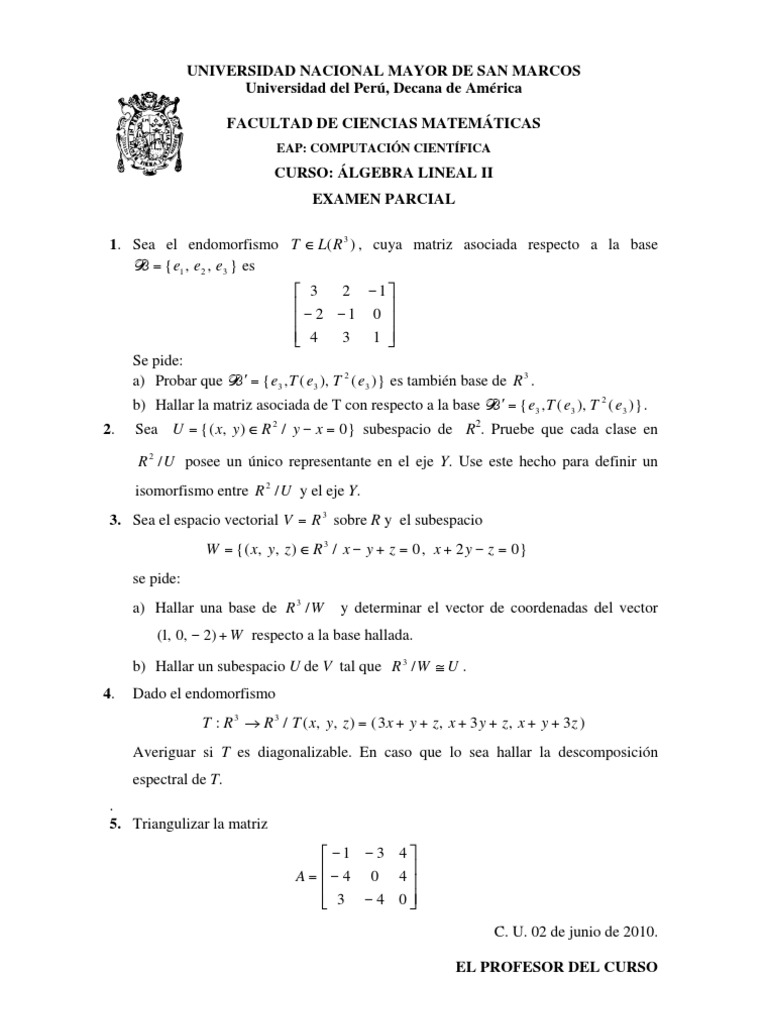 CURSO: LGEBRA LINEAL II EXAMEN PARCIAL 1. Sea el endomorfismo T L( R 3 ) , cuya matriz asociada respecto a la base B = { e1 , e2 , e3 } es