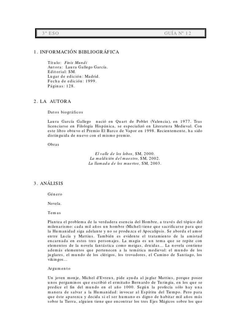 Ttulo: Finis Mundi Autora: Laura Gallego Garca. Editorial: SM. Lugar de edicin: Madrid. Fecha de edicin: 1999. Pginas: 128.