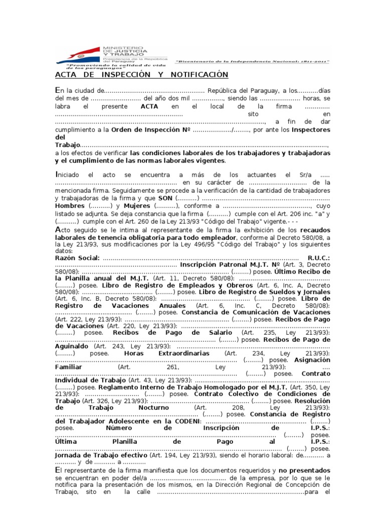 (.) cumple con el Art. 260 de la Ley 213/93 Cdigo del Trabajo vigente.- - Acto seguido se le intima al representante de la firma la exhibicin de los recaudos
