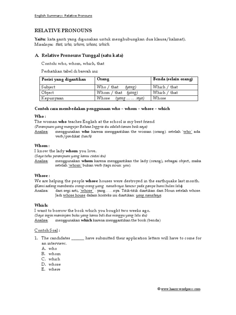 (Perempuan yang mengajar Bahasa Inggris itu adalah teman baik saya) Analisa: menggunakan who karena menggantikan the woman (orang). setelah who ada verb/predikat (teach)