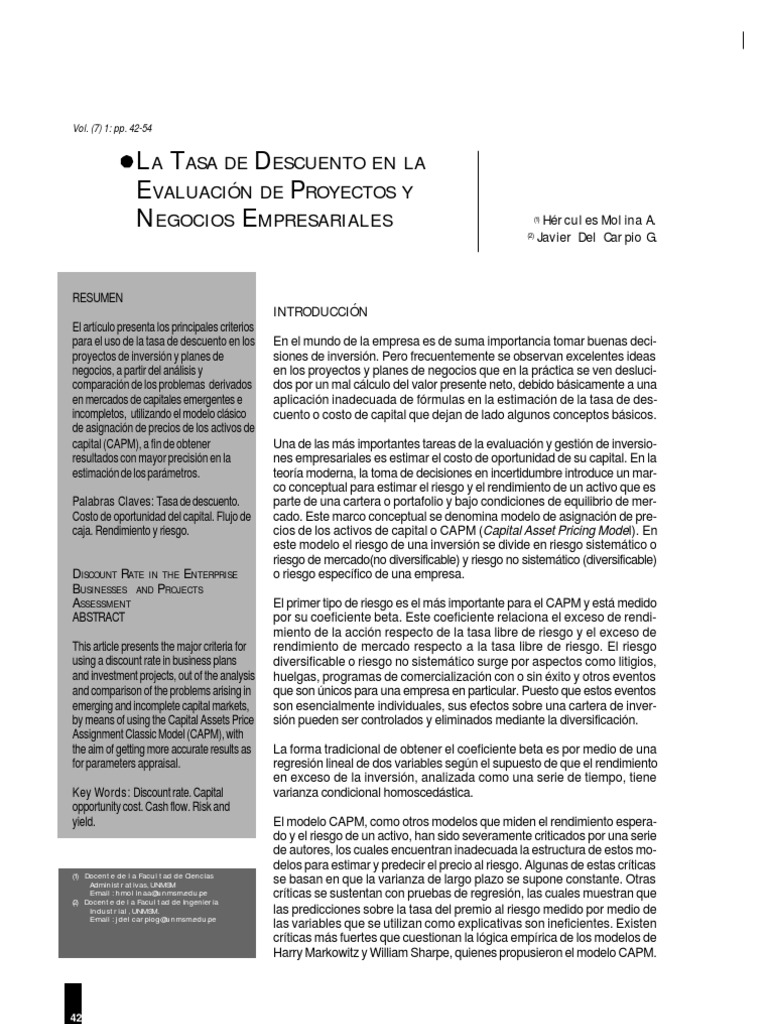 RESUMEN El artculo presenta los principales criterios para el uso de la tasa de descuento en los proyectos de inversin y planes de negocios, a partir del anlisis y comparacin de los problemas derivados en mercados de capitales emergentes e incompletos, utilizando el modelo clsico de asignacin de precios de los activos de capital (CAPM), a fin de obtener resultados con mayor precisin en la estimacin de los parmetros. Palabras Claves: Tasa de descuento. Costo de oportunidad del capital. Flujo de caja. Rendimiento y riesgo. DISCOUNT RATE IN THE ENTERPRISE BUSINESSES AND PROJECTS ASSESSMENT ABSTRACT This article presents the major criteria for using a discount rate in business plans and investment projects, out of the analysis and comparison of the problems arising in emerging and incomplete capital markets, by means of using the Capital Assets Price Assignment Classic Model (CAPM), with the aim of getting more accurate results as for parameters appraisal. Key Words: Discount rate. Capital opportunity cost. Cash flow. Risk and yield.