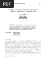 INTRODUCCIN En el mundo de la empresa es de suma importancia tomar buenas decisiones de inversin. Pero frecuentemente se observan excelentes ideas en los proyectos y planes de negocios que en la prctica se ven deslucidos por un mal clculo del valor presente neto, debido bsicamente a una aplicacin inadecuada de frmulas en la estimacin de la tasa de descuento o costo de capital que dejan de lado algunos conceptos bsicos. Una de las ms importantes tareas de la evaluacin y gestin de inversiones empresariales es estimar el costo de oportunidad de su capital. En la teora moderna, la toma de decisiones en incertidumbre introduce un marco conceptual para estimar el riesgo y el rendimiento de un activo que es parte de una cartera o portafolio y bajo condiciones de equilibrio de mercado. Este marco conceptual se denomina modelo de asignacin de precios de los activos de capital o CAPM (Capital Asset Pricing Model). En este modelo el riesgo de una inversin se divide en riesgo sistemtico o riesgo de mercado(no diversificable) y riesgo no sistemtico (diversificable) o riesgo especfico de una empresa. El primer tipo de riesgo es el ms importante para el CAPM y est medido por su coeficiente beta. Este coeficiente relaciona el exceso de rendimiento de la accin respecto de la tasa libre de riesgo y el exceso de rendimiento de mercado respecto a la tasa libre de riesgo. El riesgo diversificable o riesgo no sistemtico surge por aspectos como litigios, huelgas, programas de comercializacin con o sin xito y otros eventos que son nicos para una empresa en particular. Puesto que estos eventos son esencialmente individuales, sus efectos sobre una cartera de inversin pueden ser controlados y eliminados mediante la diversificacin. La forma tradicional de obtener el coeficiente beta es por medio de una regresin lineal de dos variables segn el supuesto de que el rendimiento en exceso de la inversin, analizada como una serie de tiempo, tiene varianza condicional homoscedstica. El modelo CAPM, como otros modelos que miden el rendimiento esperado y el riesgo de un activo, han sido severamente criticados por una serie de autores, los cuales encuentran inadecuada la estructura de estos modelos para estimar y predecir el precio al riesgo. Algunas de estas crticas se basan en que la varianza de largo plazo se supone constante. Otras crticas se sustentan con pruebas de regresin, las cuales muestran que las predicciones sobre la tasa del premio al riesgo medido por medio de las variables que se utilizan como explicativas son ineficientes. Existen crticas ms fuertes que cuestionan la lgica emprica de los modelos de Harry Markowitz y William Sharpe, quienes propusieron el modelo CAPM.