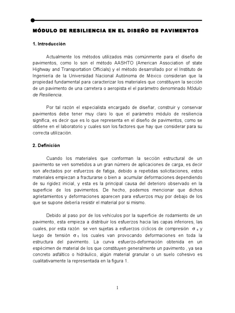 Introduccin Actualmente los mtodos utilizados ms comnmente para el diseo de pavimentos, como lo son el mtodo AASHTO (American Association of state Highway and Transportation Officials) y el mtodo desarrollado por el Instituto de Ingeniera de la Universidad Nacional Autnoma de Mxico consideran que la propiedad fundamental para caracterizar los materiales que constituyen la seccin de un pavimento de una carretera o aeropista el el parmetro denominado Mdulo de Resiliencia. Por tal razn el especialista encargado de disear, construir y conservar pavimentos debe tener muy claro lo que el parmetro mdulo de resiliencia significa, es decir que es lo que representa en el diseo de pavimentos, como se obtiene en el laboratorio y cuales son los factores que hay que considerar para su correcta utilizacin. 2. Definicin Cuando los materiales que conforman la seccin estructural de un pavimento se ven sometidos a un gran nmero de aplicaciones de carga, es decir son afectados por esfuerzos de fatiga, debido a repetidas solicitaciones, estos materiales empiezan a fracturarse o bien a acumular deformaciones dependiendo de su rigidez inicial, y esta es la principal causa del deterioro observado en la superficie de los pavimentos. De hecho, podemos mencionar que dichos agrietamientos y deformaciones aparecen para esfuerzos muy por debajo de los que se supone debera resistir el material por si mismo. Debido al paso por de los vehculos por la superficie de rodamiento de un pavimento, esta empieza a distribuir los esfuerzos hacia las capas inferiores, las cuales, por esta razn se ven sujetas a esfuerzos cclicos de compresin c y luego de tensin t los cuales van provocando deformaciones en toda la estructura del pavimento. La curva esfuerzo-deformacin obtenida en un espcimen de material de los que constituyen generalmente un pavimento , ya sea concreto asfltico o hidrulico, algn material granular o un suelo cohesivo es cualitativamente la representada en la figura 1.