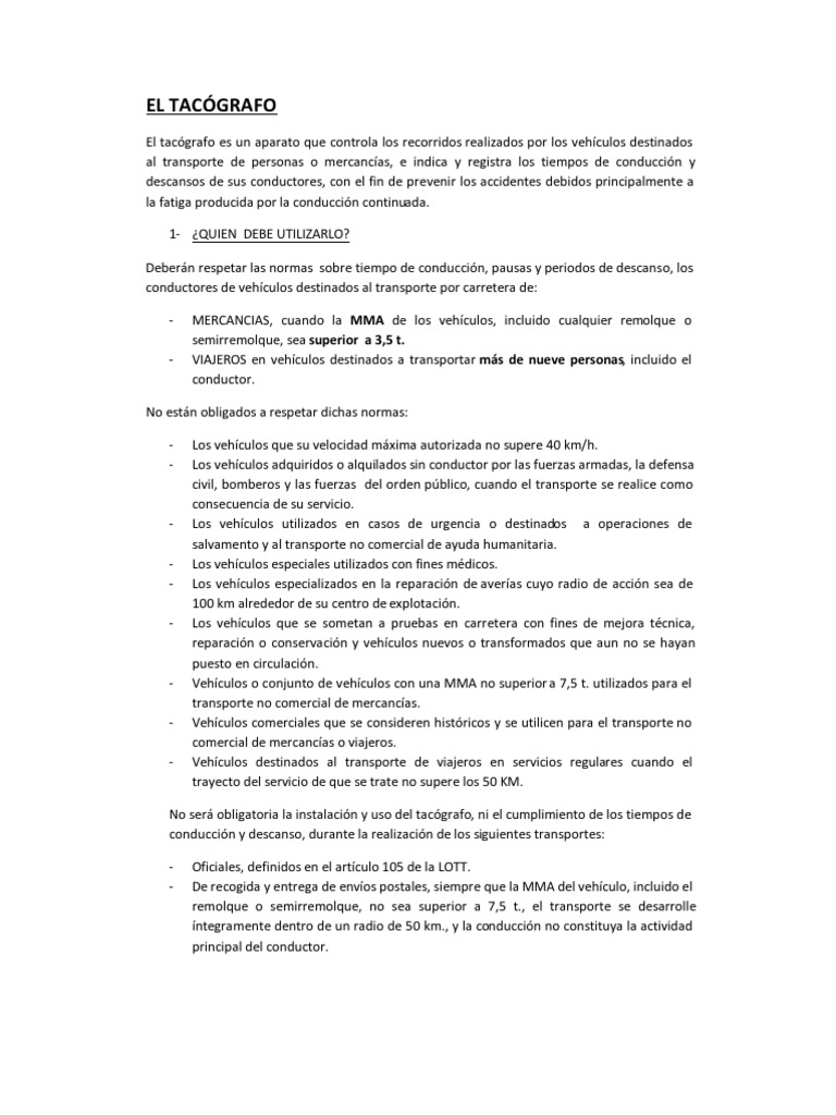 El tacgrafo es un aparato que controla los recorridos realizados por los vehculos destinados al transporte de personas o mercancas, e indica y registra los tiempos de conduccin y descansos de sus conductores, con el fin de prevenir los accidentes debidos principalmente a la fatiga producida por la conduccin continuada. 1- QUIEN DEBE UTILIZARLO? Debern respetar las normas sobre tiempo de conduccin, pausas y periodos de descanso, los conductores de vehculos destinados al transporte por carretera de: MERCANCIAS, cuando la MMA de los vehculos, incluido cualquier remolque o semirremolque, sea superior a 3,5 t. VIAJEROS en vehculos destinados a transportar ms de nueve personas, incluido el conductor.