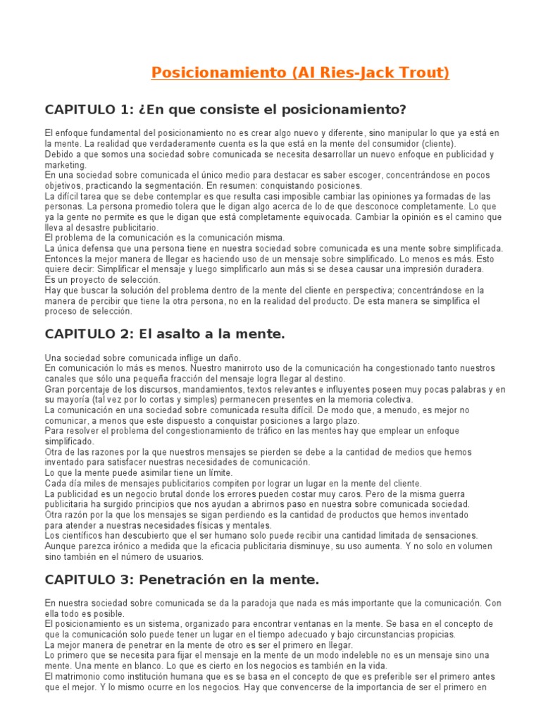 Hay que entender las palabras: Los significados no estn en las palabras; estn en la gente que las usa. Si se le da a una Empresa una palabra resquebrajada, es preferible desechar esa palabra y emplear otra. La rigidez mental es una barrera para un posicionamiento exitoso. Para salir adelante hoy en el posicionamiento se necesita cierta flexibilidad mental. Hay que seleccionar y emplear las palabras, con tanto desdn por el libro de historia como por el diccionario. Esto no quiere decir que los significados convencionales y aceptados no importen. Todo lo contrario. Hay que seleccionar las palabras que evocan los significados que se desear establecer. En cierto sentido, cada producto o servicio es un artculo empaquetado. Si no se vende dentro de una bolsa, el nombre se convierte en esa bolsa. HAY QUE ENTENDER COMO LAS PALABRAS AFECTAN A LA MENTE Las palabras son detonadores. Evocan los significados que se encuentran enterrados en la mente. Para pensar conceptualmente hay que manipular las palabras. Si se escogen las apropiadas, se puede influir en el proceso mental del lenguaje. Pero existen ciertos lmites. Si una palabra esta muy lejos del contacto con la realidad, la mente se rehsa a emplearla. Se debe ser cuidadoso con los cambios: Cada da el mundo parece girar ms rpido. Hace unos aos, un producto con xito poda vivir cincuenta aos o ms antes de decaer. Hoy, el ciclo vital de un producto es mucho ms breve. Constantemente nacen nuevos productos, nuevos servicios, nuevos mercados, incluso nuevos medios de comunicacin. Todos llegan a la madurez y luego pasan al olvido. Y otra vez comienza un ciclo nuevo. La nica cosa permanente hoy parece ser el cambio. Muchas compaas se apresuraron y se han despojado de identidad para ir en pos de la moda de las iniciales. Mientras tanto, quienes se mantuvieron firmes en el terreno de sus logros alcanzado un xito inmenso. Se necesita visin: Para hacer frente al cambio, hay que adoptar un punto de vista de largo alcance. Determinar el negocio fundamental. y ajustarse a l. Para jugar el juego con xito hay que tomar decisiones sobre lo que har la empresa no dentro de un mes o el ao que viene, sino dentro de cinco o diez aos. Hay que tener visin. Hay que aprender a separar los esfuerzos personales del movimiento general de la economa. Sea paciente. El sol brillar maana sobre quienes hoy han tomado las decisiones acertadas. Si una compaa ha adoptado un posicionamiento en la direccin apropiada, sortear las corrientes del cambio, aprovechando aquellas oportunidades que se le presenten. Se necesita valor: En los liderazgos de posicionamiento se observa que el hilo conductor no es la habilidad en marketing, ni tampoco la innovacin en los productos. Lo importante es tomar la iniciativa antes que el competidor haya tenido oportunidad de establecerse. El lder es, normalmente, quien ha invertido dinero en un marketing adecuado mientras la situacin era an fluida.