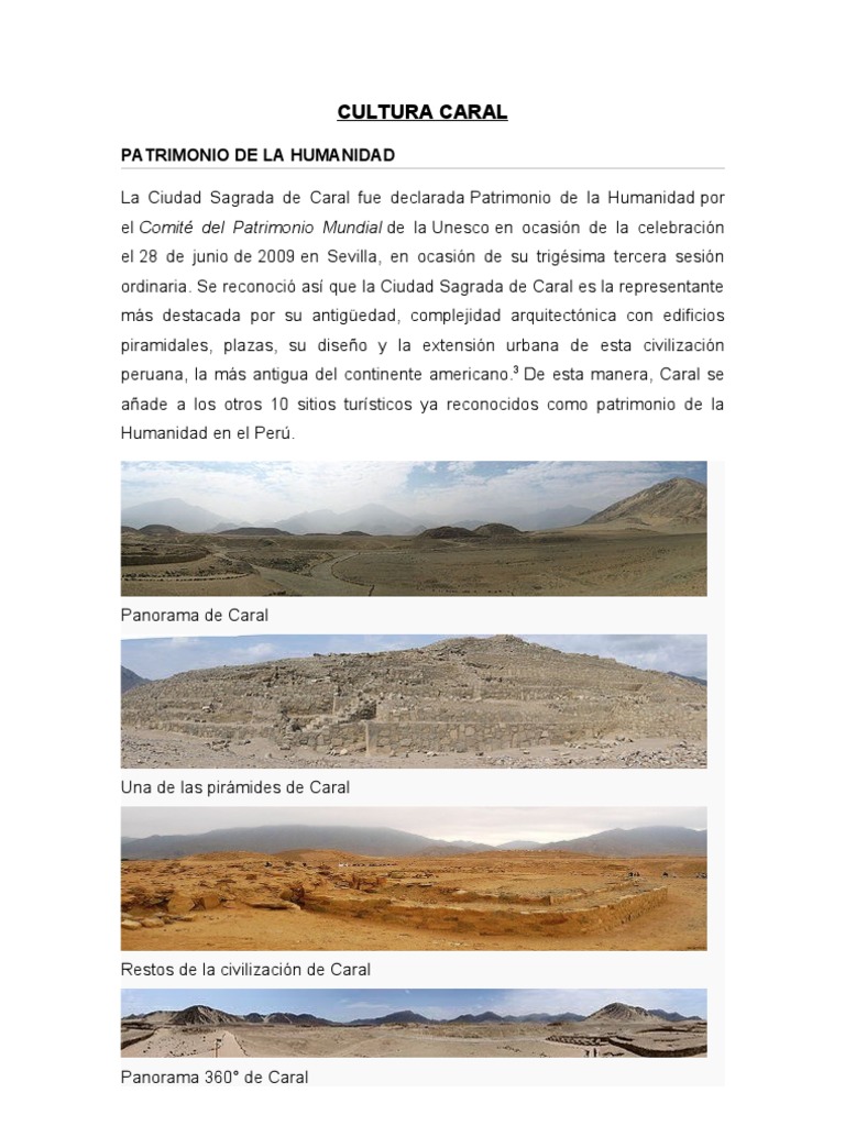 PATRIMONIO DE LA HUMANIDAD La Ciudad Sagrada de Caral fue declarada Patrimonio de la Humanidad por el Comit del Patrimonio Mundial de la Unesco en ocasin de la celebracin el 28 de junio de 2009 en Sevilla, en ocasin de su trigsima tercera sesin ordinaria. Se reconoci as que la Ciudad Sagrada de Caral es la representante ms destacada por su antigedad, complejidad arquitectnica con edificios piramidales, plazas, su diseo y la extensin urbana de esta civilizacin peruana, la ms antigua del continente americano.3 De esta manera, Caral se aade a los otros 10 sitios tursticos ya reconocidos como patrimonio de la Humanidad en el Per.