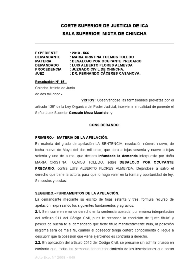 Chincha, treinta de Junio de dos mil [Link]: Observndose las formalidades previstas por el artculo 138 de la Ley Orgnica del Poder Judicial, interviene en calidad de ponente el Seor Juez Superior Gonzalo Meza Mauricio, y, CONSIDERANDO: PRIMERO.- MATERIA DE LA APELACIN. Es materia del grado de apelacin LA SENTENCIA, resolucin nmero nueve, de fecha nueve de Mayo del dos mil once, que obra a fojas sesenta y nueve a fojas setenta y uno de autos, que declara Infundada la demanda interpuesta por doa MARIA CRISTINA TOLMOS TOLEDO, sobre DESALOJO POR OCUPANTE PRECARIO, contra LUIS ALBERTO FLORES ALMEYDA. Dejndose a salvo el derecho que tiene la actora, para que lo haga valer en la forma y oportunidad de ley. Sin costos y costas. SEGUNDO.- FUNDAMENTOS DE LA APELACIN. La demandante mediante su escrito de fojas setenta y tres, formula recurso de apelacin expresando los siguientes fundamentos y agravios: 2.1. Se incurre en error de derecho en la sentencia apelada, por errnea interpretacin del artculo 911 del Cdigo Civil, pues le reconoce la condicin de justo ttulo y poseer de buena fe al demandado que tiene ttulo manifiestamente nulo, la posesin ilegtima ser de mala fe, cuando el poseedor tenga certero conocimiento o llegue a descubrir que la posesin que viene ejerciendo es contraria a derecho. 2.2. En aplicacin del artculo 2012 del Cdigo Civil, se presume sin admitir prueba en contrario que, todas las personas tienen conocimiento de las inscripciones que obran