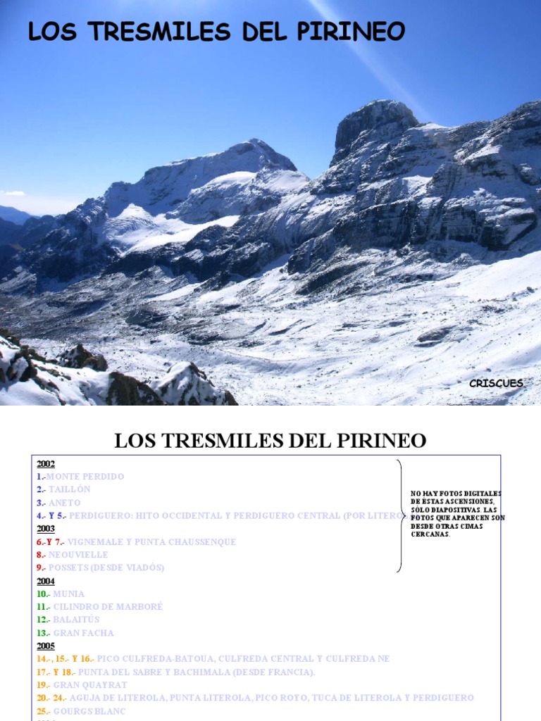 2002 1.-MONTE PERDIDO 2.- TAILLN NO HAY FOTOS DIGITALES DE STAS ASCENSIONES, 3.- ANETO SLO DIAPOSITIVAS. LAS 4.- Y 5.- PERDIGUERO: HITO OCCIDENTAL Y PERDIGUERO CENTRAL (POR LITEROLA) FOTOS QUE APARECEN SON DESDE OTRAS CIMAS 2003 CERCANAS. 6.-Y 7.- VIGNEMALE Y PUNTA CHAUSSENQUE 8.- NEOUVIELLE 9.- POSSETS (DESDE VIADS) 2004 10.- MUNIA 11.- CILINDRO DE MARBOR 12.- BALAITS 13.- GRAN FACHA 2005 14.-, 15.- Y 16.- PICO CULFREDA-BATOUA, CULFREDA CENTRAL Y CULFREDA NE 17.- Y 18.- PUNTA DEL SABRE Y BACHIMALA (DESDE FRANCIA). 19.- GRAN QUAYRAT 20.- 24.- AGUJA DE LITEROLA, PUNTA LITEROLA, PICO ROYO, TUCA DE LITEROLA Y PERDIGUERO 25.- GOURGS BLANC 2006 26.- - 28.- PICOS OCCIDENTAL, CENTRAL Y ORIENTAL DE LOS INFIERNOS. 29.-Y 30.- GRAN ASTAZU Y PEQUEO ASTAZU