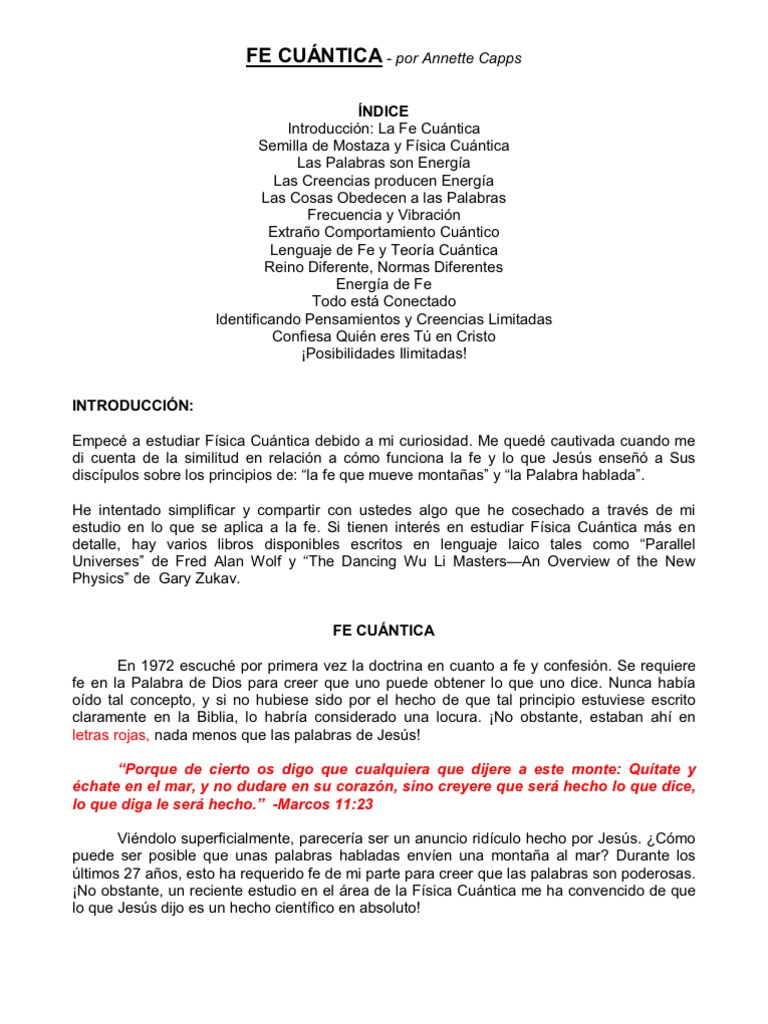 NDICE Introduccin: La Fe Cuntica Semilla de Mostaza y Fsica Cuntica Las Palabras son Energa Las Creencias producen Energa Las Cosas Obedecen a las Palabras Frecuencia y Vibracin Extrao Comportamiento Cuntico Lenguaje de Fe y Teora Cuntica Reino Diferente, Normas Diferentes Energa de Fe Todo est Conectado Identificando Pensamientos y Creencias Limitadas Confiesa Quin eres T en Cristo Posibilidades Ilimitadas! INTRODUCCIN: Empec a estudiar Fsica Cuntica debido a mi curiosidad. Me qued cautivada cuando me di cuenta de la similitud en relacin a cmo funciona la fe y lo que Jess ense a Sus discpulos sobre los principios de: la fe que mueve montaas y la Palabra hablada. He intentado simplificar y compartir con ustedes algo que he cosechado a travs de mi estudio en lo que se aplica a la fe. Si tienen inters en estudiar Fsica Cuntica ms en detalle, hay varios libros disponibles escritos en lenguaje laico tales como Parallel Universes de Fred Alan Wolf y The Dancing Wu Li MastersAn Overview of the New Physics de Gary Zukav. FE CUNTICA En 1972 escuch por primera vez la doctrina en cuanto a fe y confesin. Se requiere fe en la Palabra de Dios para creer que uno puede obtener lo que uno dice. Nunca haba odo tal concepto, y si no hubiese sido por el hecho de que tal principio estuviese escrito claramente en la Biblia, lo habra considerado una locura. No obstante, estaban ah en letras rojas, nada menos que las palabras de Jess! Porque de cierto os digo que cualquiera que dijere a este monte: Qutate y chate en el mar, y no dudare en su corazn, sino creyere que ser hecho lo que dice, lo que diga le ser hecho. -Marcos 11:23 Vindolo superficialmente, parecera ser un anuncio ridculo hecho por Jess. Cmo puede ser posible que unas palabras habladas enven una montaa al mar? Durante los ltimos 27 aos, esto ha requerido fe de mi parte para creer que las palabras son poderosas. No obstante, un reciente estudio en el rea de la Fsica Cuntica me ha convencido de que lo que Jess dijo es un hecho cientfico en absoluto!