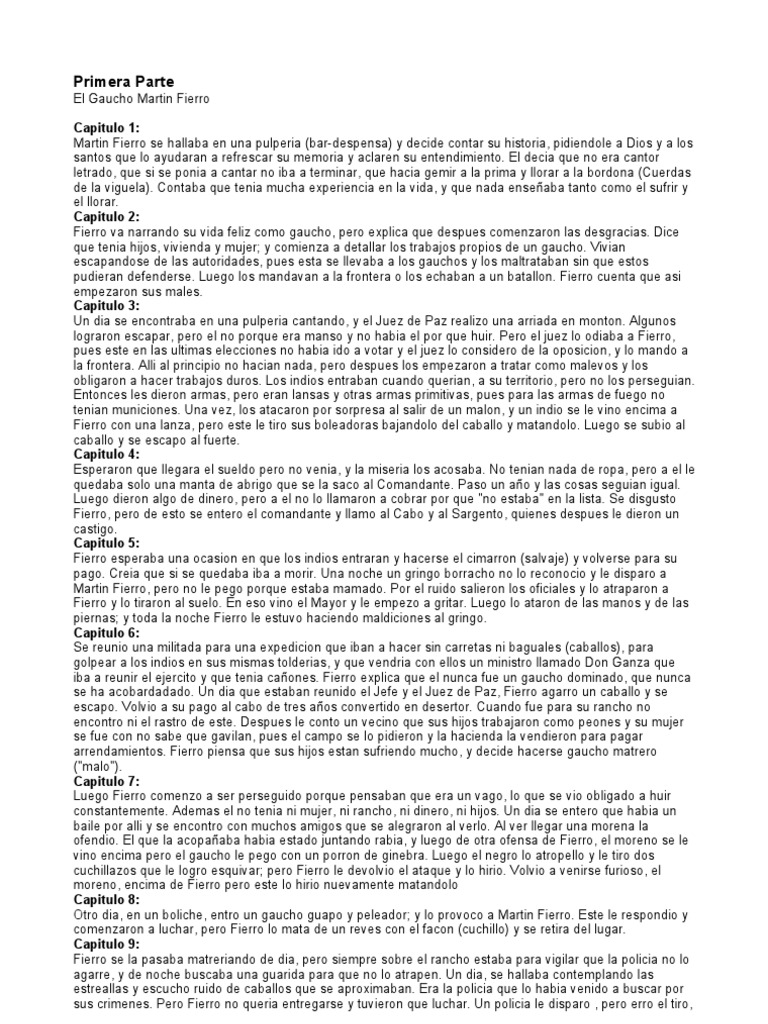 El Gaucho Martin Fierro Capitulo 1: Martin Fierro se hallaba en una pulperia (bar-despensa) y decide contar su historia, pidiendole a Dios y a los santos que lo ayudaran a refrescar su memoria y aclaren su entendimiento. El decia que no era cantor letrado, que si se ponia a cantar no iba a terminar, que hacia gemir a la prima y llorar a la bordona (Cuerdas de la viguela). Contaba que tenia mucha experiencia en la vida, y que nada enseaba tanto como el sufrir y el llorar. Capitulo 2: Fierro va narrando su vida feliz como gaucho, pero explica que despues comenzaron las desgracias. Dice que tenia hijos, vivienda y mujer; y comienza a detallar los trabajos propios de un gaucho. Vivian escapandose de las autoridades, pues esta se llevaba a los gauchos y los maltrataban sin que estos pudieran defenderse. Luego los mandavan a la frontera o los echaban a un batallon. Fierro cuenta que asi empezaron sus males. Capitulo 3: Un dia se encontraba en una pulperia cantando, y el Juez de Paz realizo una arriada en monton. Algunos lograron escapar, pero el no porque era manso y no habia el por que huir. Pero el juez lo odiaba a Fierro, pues este en las ultimas elecciones no habia ido a votar y el juez lo considero de la oposicion, y lo mando a la frontera. Alli al principio no hacian nada, pero despues los empezaron a tratar como malevos y los obligaron a hacer trabajos duros. Los indios entraban cuando querian, a su territorio, pero no los perseguian. Entonces les dieron armas, pero eran lansas y otras armas primitivas, pues para las armas de fuego no tenian municiones. Una vez, los atacaron por sorpresa al salir de un malon, y un indio se le vino encima a Fierro con una lanza, pero este le tiro sus boleadoras bajandolo del caballo y matandolo. Luego se subio al caballo y se escapo al fuerte. Capitulo 4: Esperaron que llegara el sueldo pero no venia, y la miseria los acosaba. No tenian nada de ropa, pero a el le quedaba solo una manta de abrigo que se la saco al Comandante. Paso un ao y las cosas seguian igual. Luego dieron algo de dinero, pero a el no lo llamaron a cobrar por que "no estaba" en la lista. Se disgusto Fierro, pero de esto se entero el comandante y llamo al Cabo y al Sargento, quienes despues le dieron un castigo. Capitulo 5: Fierro esperaba una ocasion en que los indios entraran y hacerse el cimarron (salvaje) y volverse para su pago. Creia que si se quedaba iba a morir. Una noche un gringo borracho no lo reconocio y le disparo a Martin Fierro, pero no le pego porque estaba mamado. Por el ruido salieron los oficiales y lo atraparon a Fierro y lo tiraron al suelo. En eso vino el Mayor y le empezo a gritar. Luego lo ataron de las manos y de las piernas; y toda la noche Fierro le estuvo haciendo maldiciones al gringo. Capitulo 6: Se reunio una militada para una expedicion que iban a hacer sin carretas ni baguales (caballos), para golpear a los indios en sus mismas tolderias, y que vendria con ellos un ministro llamado Don Ganza que iba a reunir el ejercito y que tenia caones. Fierro explica que el nunca fue un gaucho dominado, que nunca se ha acobardadado. Un dia que estaban reunido el Jefe y el Juez de Paz, Fierro agarro un caballo y se escapo. Volvio a su pago al cabo de tres aos convertido en desertor. Cuando fue para su rancho no encontro ni el rastro de este. Despues le conto un vecino que sus hijos trabajaron como peones y su mujer se fue con no sabe que gavilan, pues el campo se lo pidieron y la hacienda la vendieron para pagar arrendamientos. Fierro piensa que sus hijos estan sufriendo mucho, y decide hacerse gaucho matrero ("malo"). Capitulo 7: Luego Fierro comenzo a ser perseguido porque pensaban que era un vago, lo que se vio obligado a huir constantemente. Ademas el no tenia ni mujer, ni rancho, ni dinero, ni hijos. Un dia se entero que habia un baile por alli y se encontro con muchos amigos que se alegraron al verlo. Al ver llegar una morena la ofendio. El que la acopaaba habia estado juntando rabia, y luego de otra ofensa de Fierro, el moreno se le vino encima pero el gaucho le pego con un porron de ginebra. Luego el negro lo atropello y le tiro dos cuchillazos que le logro esquivar; pero Fierro le devolvio el ataque y lo hirio. Volvio a venirse furioso, el moreno, encima de Fierro pero este lo hirio nuevamente matandolo Capitulo 8: Otro dia, en un boliche, entro un gaucho guapo y peleador; y lo provoco a Martin Fierro. Este le respondio y comenzaron a luchar, pero Fierro lo mata de un reves con el facon (cuchillo) y se retira del lugar. Capitulo 9: Fierro se la pasaba matreriando de dia, pero siempre sobre el rancho estaba para vigilar que la policia no lo agarre, y de noche buscaba una guarida para que no lo atrapen. Un dia, se hallaba contemplando las estreallas y escucho ruido de caballos que se aproximaban. Era la policia que lo habia venido a buscar por sus crimenes. Pero Fierro no queria entregarse y tuvieron que luchar. Un policia le disparo , pero erro el tiro,